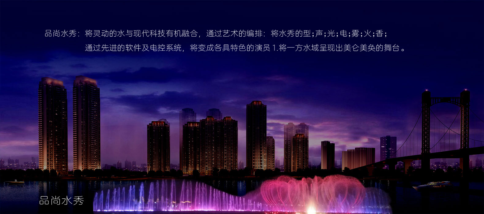 品尚水秀 隸屬于寧波品尚景觀工程有限公司, 品尚水秀是一家享有國際聲譽的舞美聲光秀水景跨國企業(yè);業(yè)務(wù)范圍涉及音樂噴泉,程控噴泉,廣場噴泉,城市景觀噴泉,湖內(nèi)浮筒噴泉,小區(qū)噴泉,大型室內(nèi)噴泉的工程設(shè)計施工,霧森系統(tǒng),人造冷霧,高壓人造霧...